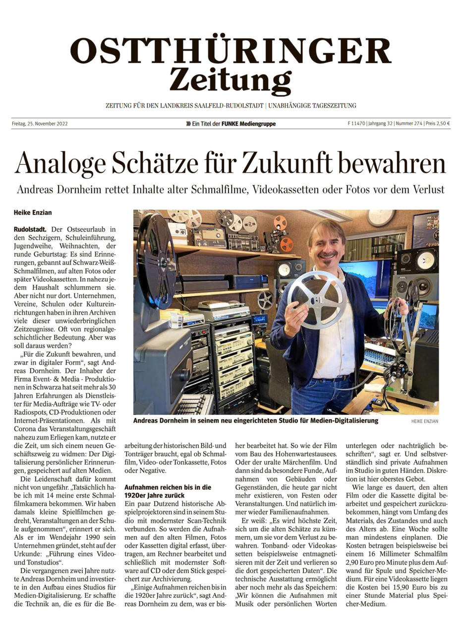 Quelle: Ostthüringer Zeitung vom 22.03.25; Text: OTZ-Redakteurin Heike Enzian / Studio-Foto: Iris Tomoschat / Foto Filmdose: Christel Schwarz